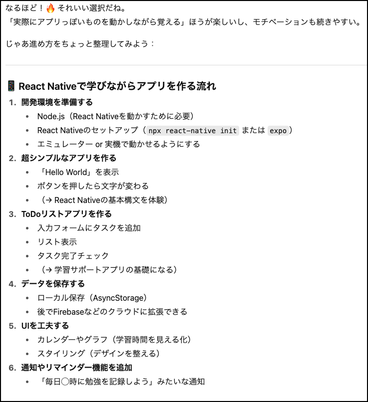 ChatGPTに「プログラミング初心者なので学習をサポートしてほしい」と依頼すると、こちらの学習レベルと目的を聞いてきて、それに合わせて学習プランをいくつか提示する。以後、ChatGPTの示す選択肢から選ぶことで学習が進んでいく。