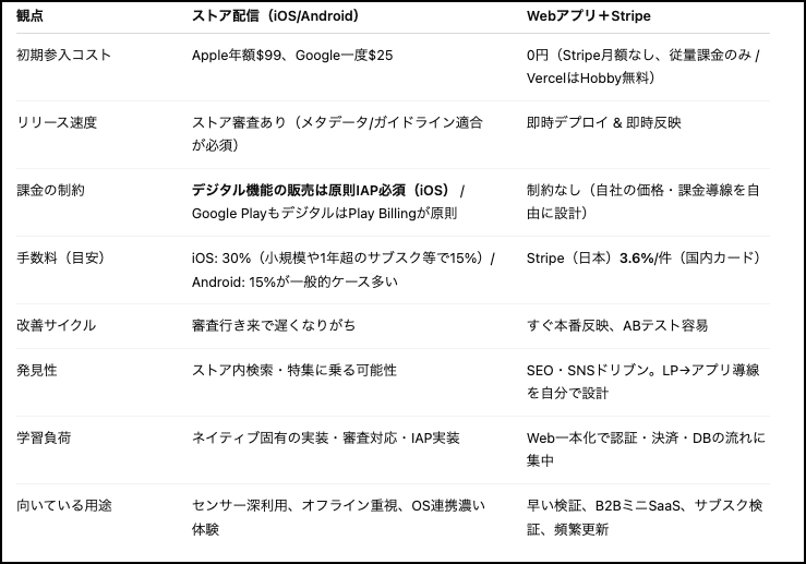 アプリのストア販売は、ユーザーからの見つけられやすさでも課金しやすさでも有利に思えるが、実際にはストア側の審査の厳しさや出店コスト、料率の高さ、開発側の過当競争などによっていくつものハードルがある。それに対してWebアプリは審査がなく、課金システムの標準となった『Stripe』の料率の低さから初心者向けとなっている。