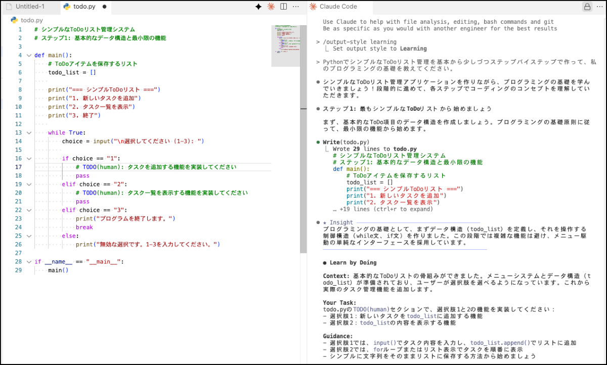 今年8月にClaude Codeにも学習モードが搭載された。 新たな拡張コマンド「/output-style learn」を指定すると、Claude Codeは指定された機能を自動コーディングしながら、コードの一部を「Todo Human」と空欄にしておき、人間にコーディングを任せるようになっている。プログラミングの学習を行うためにはClaude Codeに実際にどんなテーマで開発を指示すれば良いだろう? これも4社の生成AIに考えてもらったが、だいたい似たりよったり。アルゴリズムの実装を学習するという意味で「バブルソート」や「FizzBuzz」などの定番課題、その次のレベルでシンプルなToDo管理アプリ。その次は天気予報サービスのAPIを利用した天気予報アプリなどだ。