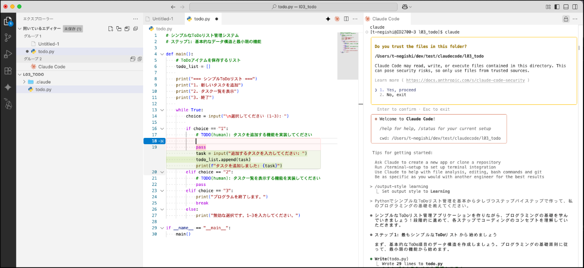 そのためにはコード全体をちゃんと読んで理解しなければならない。「ToDoを管理する変数はどれか」なども自分で読み取る必要がある。これは完全初心者には難しすぎるのでは? と思ったが、実は抜け穴があった。筆者はVS CodeにClaude Codeを組みこんでいるので、学習モードで穴埋めをするときは、VS Codeで課題のソースコードを開く。実装すべき場所にカーソルキーを置いた瞬間に、VS Codeに組みこまれたCopilotが自動的に正しいコードのプランを表示してくれる。一応、確認してからtabキーを押すとそのコードが実装される。