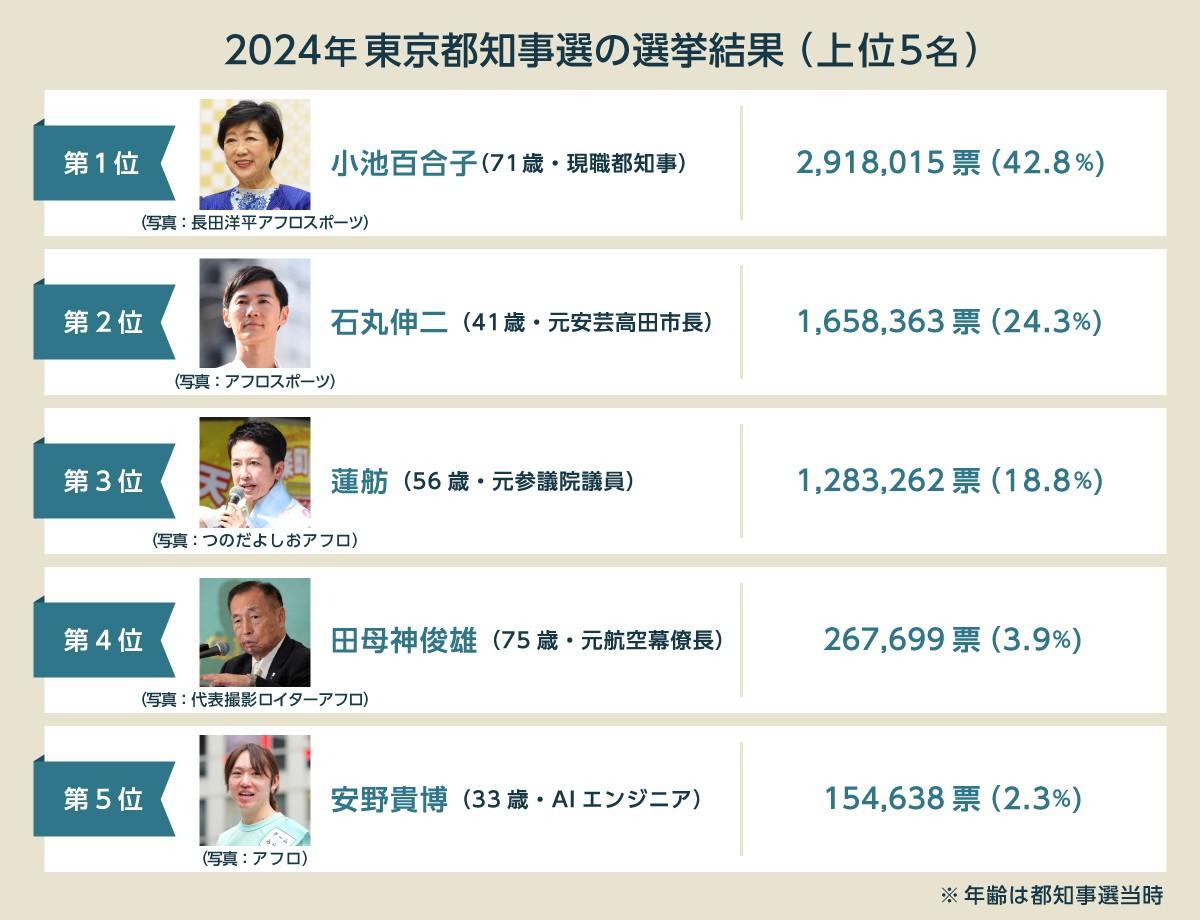 選挙の結果は、現職の小池氏が約292万票(約43%)を得て圧勝した。そこで驚くべきことに、蓮舫氏を抑えて、まったく政党や組織の支援を受けなかった石丸 伸二氏が約166万票(約19%)を得て次点に躍り出たのである。
