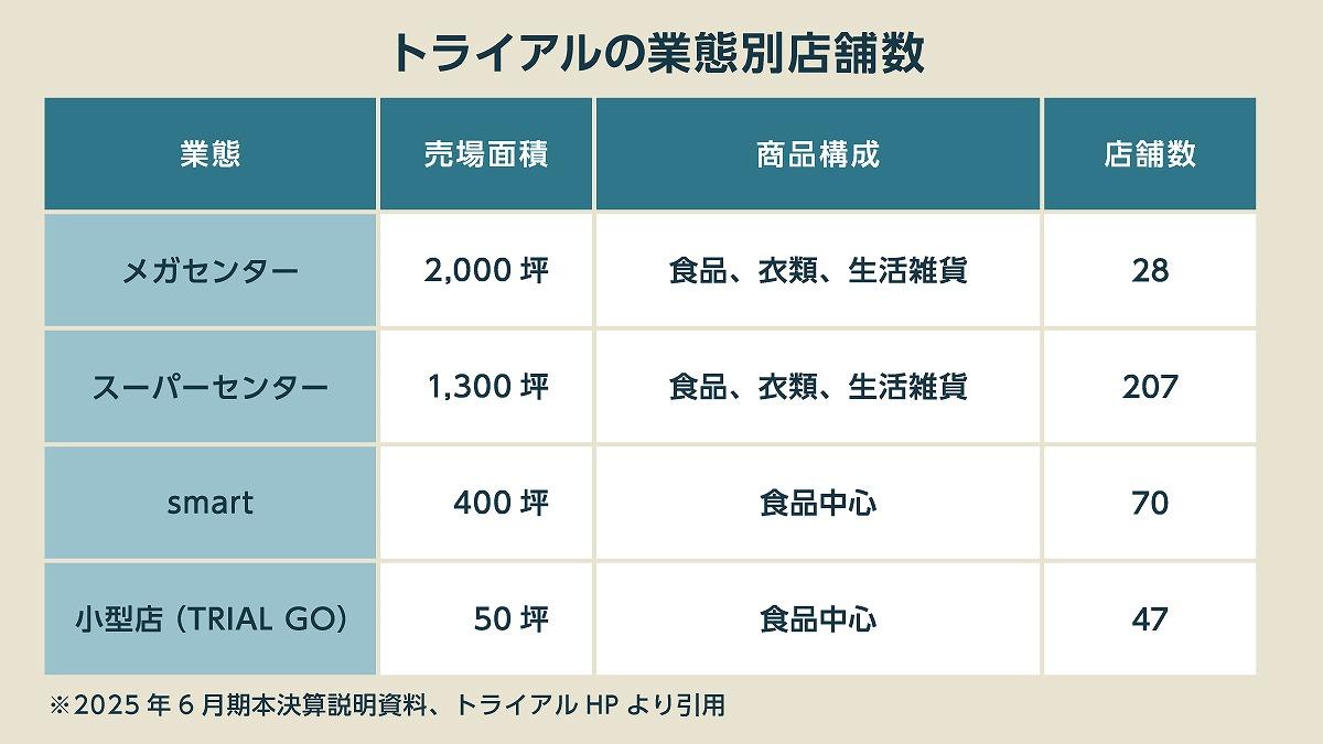 トライアルHDは1974年にリサイクルショップの「あさひ屋」として創業した。80年代には社名をトライアルカンパニーに変更。この頃には家電量販店を運営するほか、IT企業として小売業向けのPOSシステムの開発を手がけるようになる。92年にディスカウントストア「トライアル」をオープンし、これが現在の主力事業となった。POSシステムを開発するには実店舗で得たノウハウを活用しなければならない。一方で、開発に成功したとしても、導入には店舗の構造を変える必要があるため、自前のルールを持つ大手チェーンは他社のシステムを導入したがらない。そうした背景から実験店を本業に変え、小売業に生まれ変わったと言われている。