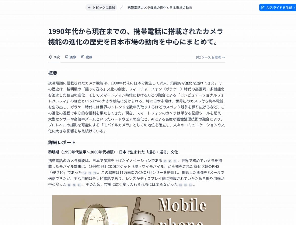 意図した形に仕上げることが容易なため、最終段階までツール上で完結させたいときに適している。リサーチから資料作成、さらに細かな調整まで一貫して行いたい場合に、特に力を発揮するツールといえるだろう。 【次ページ】Genspark:音声やスライドは別のモードで作成