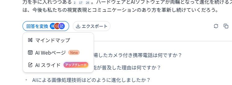 リサーチ結果を他の形式のコンテンツに変換できる機能も充実している。スライドやWebページ、マインドマップの形式に変換でき、いずれもレポート最下部の「回答を変換」ボタンからコンテンツの種類を選ぶだけで生成される。
