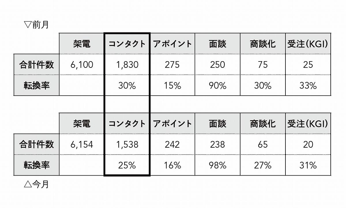 では、なぜコンタクト率が下がったのでしょうか。ここで、さらに詳細なデータを見ます。 【次ページ】原因を特定したことで立てられた、具体的な改善策4つ