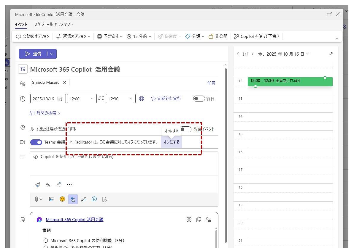 会議におけるファシリテーターは、会議中の議論を円滑に進め、参加者の議論をまとめながら収束点を探り、時間内に結論やゴールへ導く役割を担います。しかし実際には、参加者の中で誰がその役を担うのかが不明確であったり、議論もしながら会議の進行も担うというのは負担が大きかったりという課題があります。今回Teamsに追加されたファシリテーターエージェントとは、そうした会議の進行を支援するエージェントです。会議の予定作成時、下の図のようにエージェントを有効化するだけで、設定された議題ごとの時間配分にもとづく進行や、議論された内容の整理を手伝ってくれます。