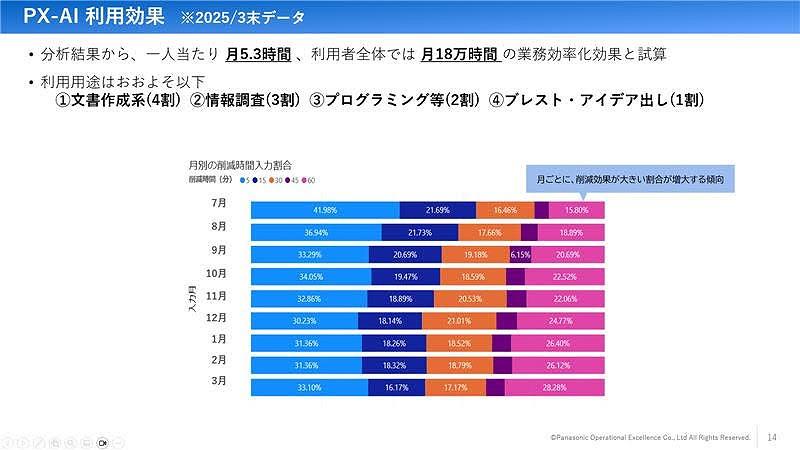 井上氏:PX-AIにおける業務効率化については、直近では1人当たり1カ月で平均5.3時間(注) の削減となりました。グループ全体で見ると月で約18万時間の削減となり、一定の成果を得られています。効率化に関する集計は毎月行っており、削減時間は伸び続けています。