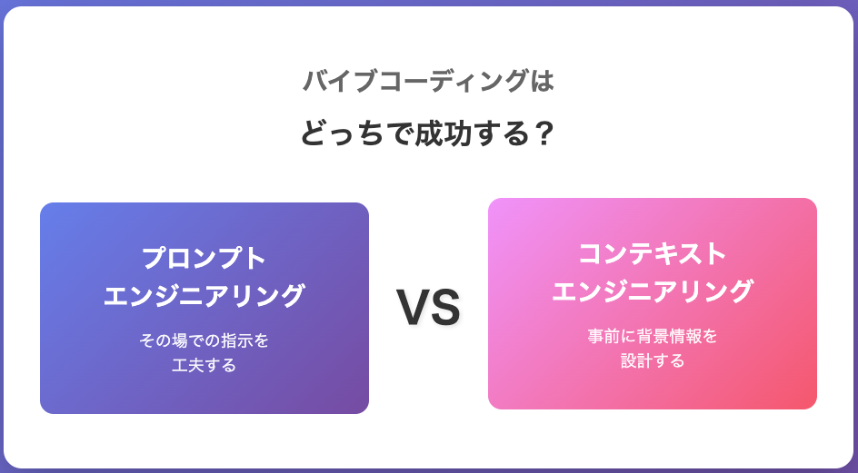 インターネットで「生成AIをうまく使うコツ」として広まっているのが「プロンプトエンジニアリング」だ。これは「質問や指示の仕方を工夫する」というアプローチだ。「〇〇で、△△に注意して、□□という形式で答えてください」というふうに、その都度、細かく指示を工夫する。単発的な質問や簡単なタスクであれば、プロンプトエンジニアリングは有効だ。しかし、アプリケーション開発のような複雑で長期的なプロジェクトには、それだけだと限界がある。毎回、同じような背景説明が必要で、AIに「このプロジェクトはこういうスタイルで進めるんだな」という全体像が伝わりにくいのだ。その結果としてコードの完成度が低くなる。