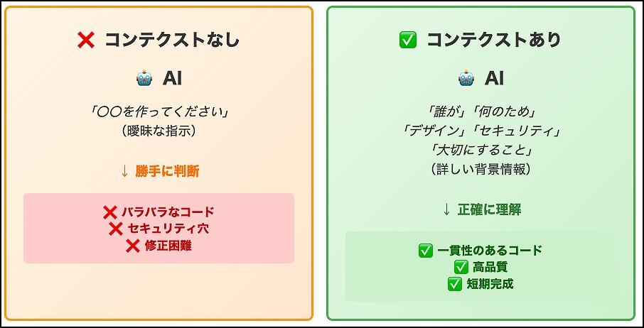 ユーザーは誰なのか。何のために使うアプリなのか。どんなデザインにしたいのか。安全性はどこまで重要か。といった情報をあらかじめAIに渡しておく。こうした情報があれば、AIはあなたの意図を正しく反映して、より適切で質の高いコードを書くようになる。
