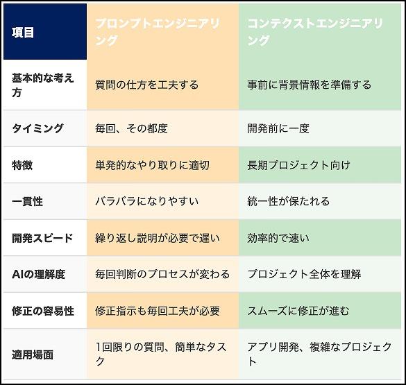 コンテクストエンジニアリングは、まったく異なるアプローチだ。アプリ開発を始める前に、「このプロジェクトはこういう考え方で作るんですよ」という背景や方針をまとめて、事前にAIに教える。すると、それ以後はAIが基本方針に合わせて判断してくれるようになるのだ。 これは、プロンプトエンジニアリングの発展形であり、生成AIの出力精度を高めるための“環境設計技法”と言える。