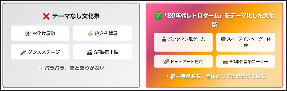 学校の文化祭を思い浮かべてほしい。実行委員会から「出し物は何でもいいから好きにやってください」と言われた場合と、「今年は『80年代のレトロゲーム』がテーマです。その枠の中で自由に企画してください」と言われた場合では、どう変わるだろう? 後者のほうがコンセプトが明確な、まとまりのある文化祭になるはずだ。