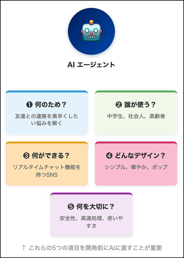 そして、それぞれの段階で指示を出すときに、ステップ1で説明したプロジェクトのコンセプトを毎回ちょっと加えるのだ。たとえば「次はログイン機能を作ります。ステップ1で説明したように『シンプルで安全に』お願いします。小学生でも分かる表示にしてください」というような具合である。