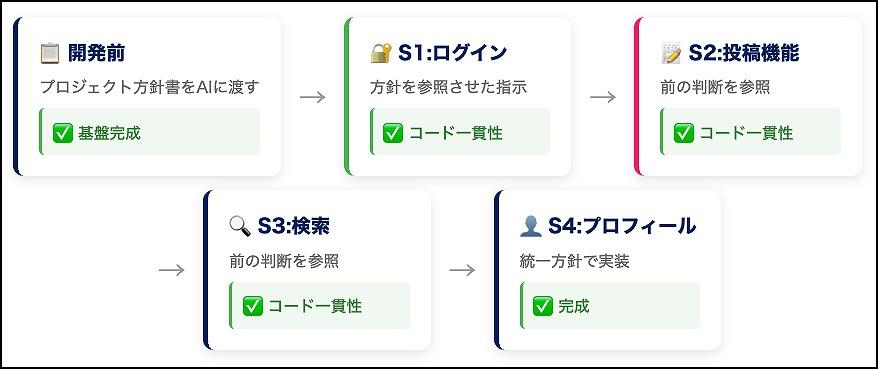 こうした背景情報を段階的に加えていくことで、AIが「あ、このプロジェクトのテーマは『シンプルで安全』なんだ」と段々と理解を深める。その結果、各機能が自然と一貫性を持つようになり、バラバラなコードが出てくる可能性が大幅に減るのだ。