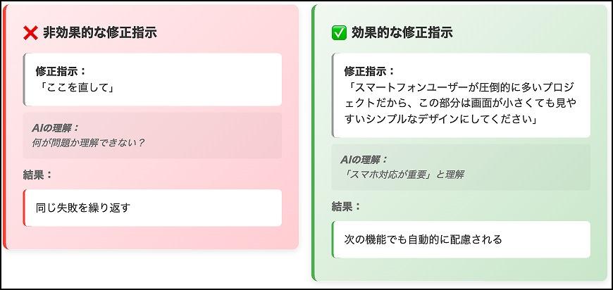理由を伝えると、AIが「なるほど、このプロジェクトではスマホ対応が重要なんだ」と理解して、同じセッション内ではその方針を反映した出力を続けやすくなる。 このフィードバックのループが、長期的な開発の質を飛躍的に高める。