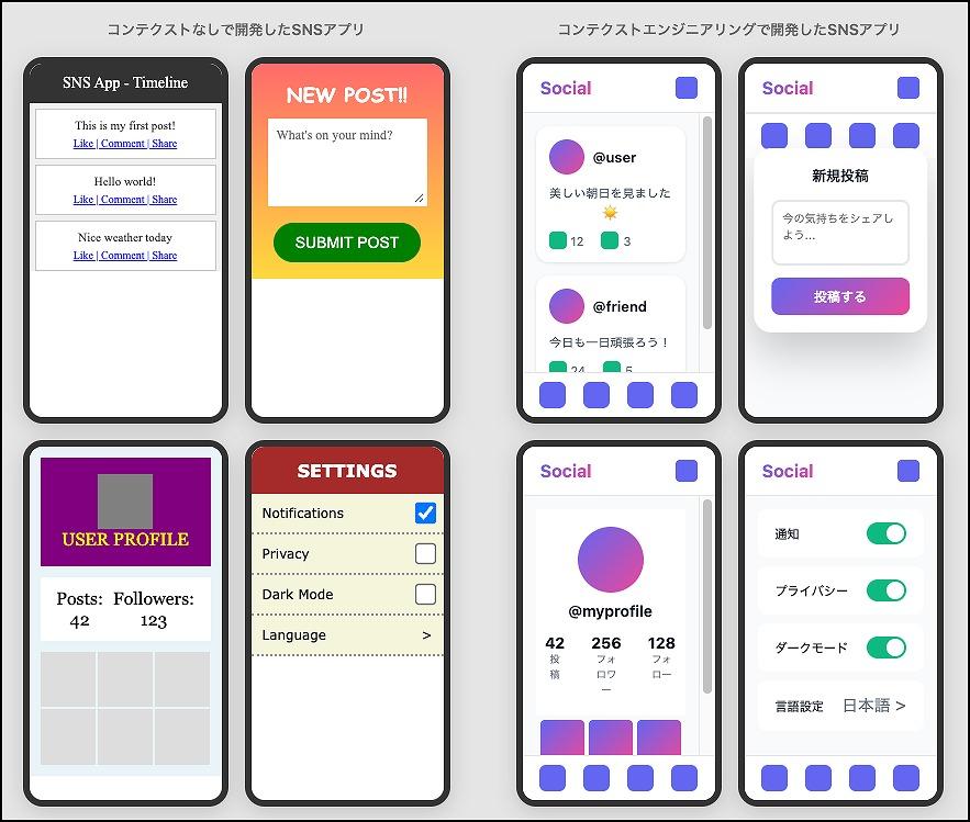 SNS的なアプリを作るという初心者を想像してみよう。コンテクストなしで開発した場合、投稿画面とプロフィール画面のデザインがバラバラになったり、削除操作の仕組みが不統一になったりする。完成はしたが、使い勝手が悪く、修正に何日も費やさなければならない。