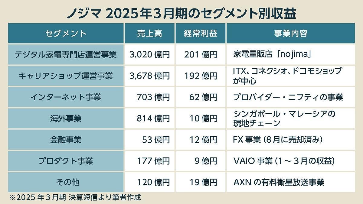 デジタル家電専門店運営事業は「nojima」の事業であり、期末時点で248店舗を展開している。量販店はすべて直営店だ。キャリアショップ運営事業は主にドコモショップの事業であり、2015年以降にM&Aで規模を拡大した。期末時点で直営店647・FC店288の計935店舗を展開している。