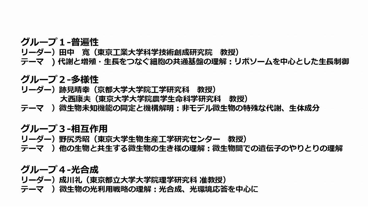 微生物の機能探求を、「代謝と増殖・生長をつなぐ細胞の共通基盤の理解」「微生物未知機能の同定と機構解明」などのテーマで、「普遍性」「多様性」「相互作用」「光合成」の4つのグループで進めている。設立当初から関わってきた東京科学大学 総合研究院 教授の田中 寛氏は次のように語る。