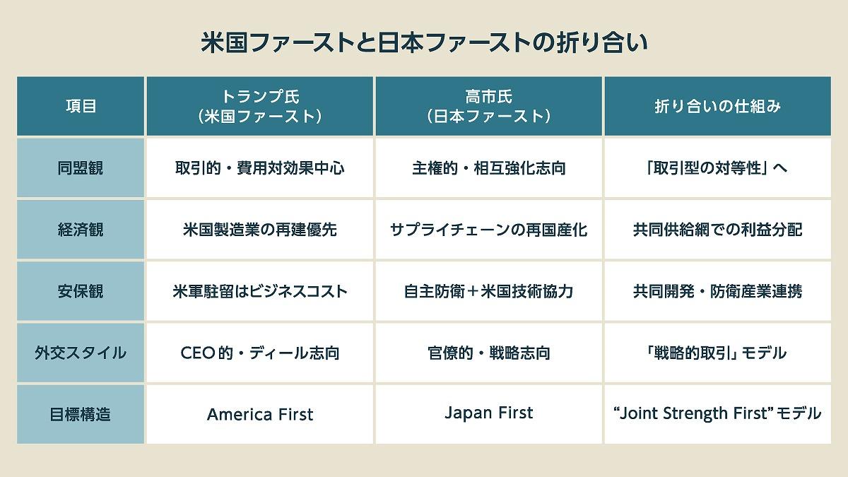 この新しい戦略でトランプ氏の上を行くのが、高市氏の「日本ファースト」である。「米国が守る/日本が負担する」、「対米追随か自主路線か」という二項対立を超え、「国益」の基盤である「外交力・防衛力・経済力・技術力・情報力・人材力」のすべてを組み合わせ、日米が「対等な取引」相手として「条件交渉」し、「リスク管理と相互利益を担保する政策」に落とし込み、ビジネスパートナーとして「競い合いながらも協働」する。