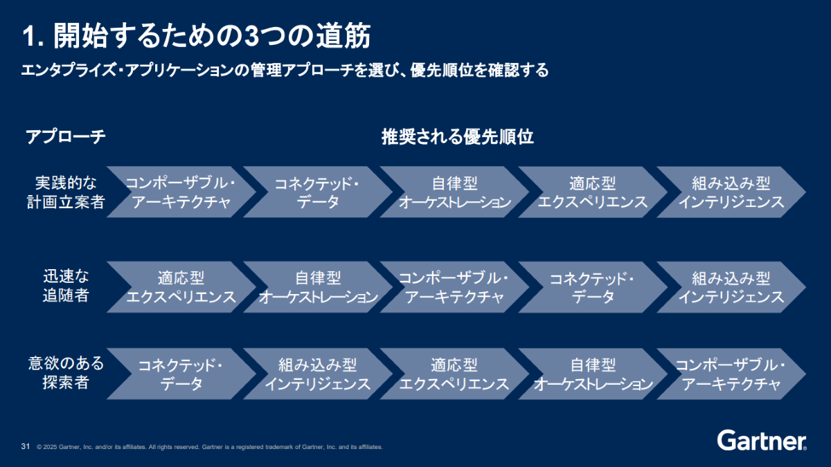これら5つの原則の実現に向け、ガートナーでは企業の置かれた環境や意欲に応じて、たとえば着実な導入を重視するのであれば、コンポーサブル・アーキテクチャーから実装を開始するといった具合に次の3つの推進シナリオが推奨しているのだとウォン氏は話す。