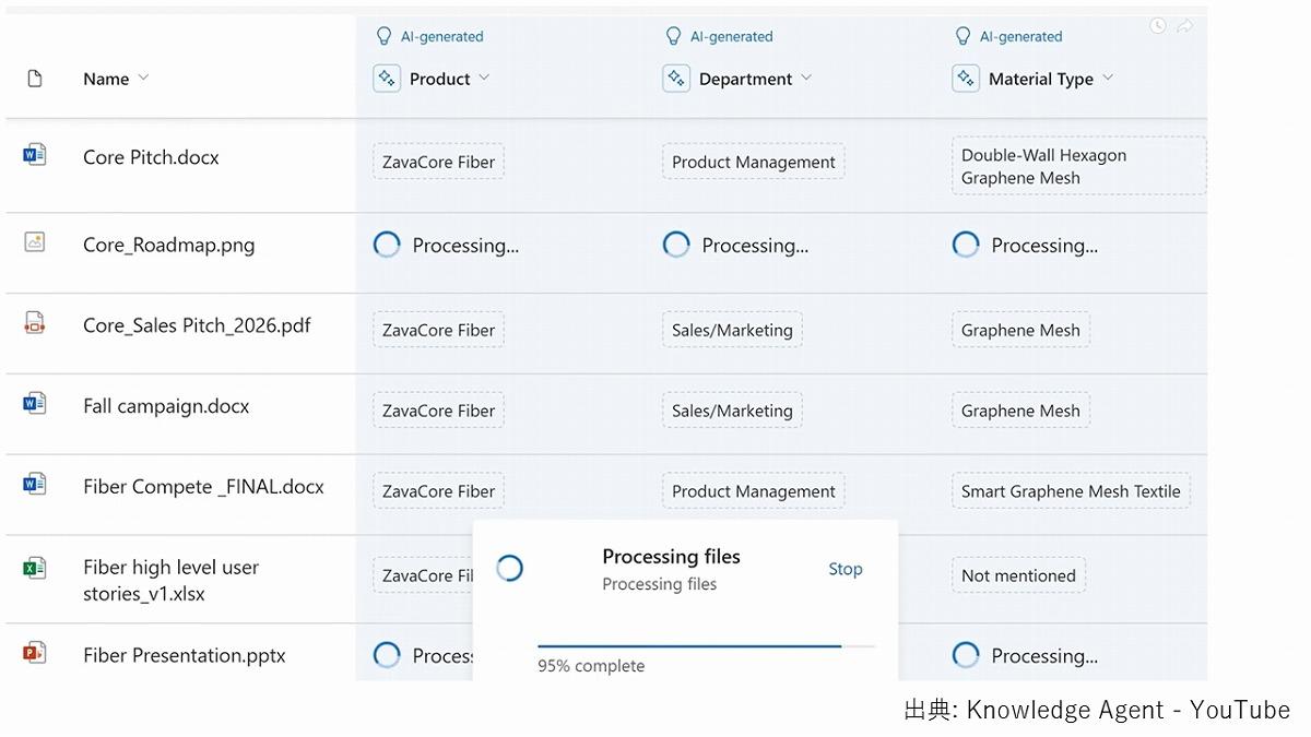 SharePoint Knowledgeエージェントは、SharePoint Onlineに保存されたドキュメントを、人にもAIにも使いやすい形で整理してくれるエージェントです。SharePointでドキュメントを管理する際には、適切なメタデータを付与することが重要とされていますが、人手で徹底するのは難しく、長年の課題となっていました。新しく登場するSharePoint Knowledgeエージェントは、ファイルをアップロードするだけで、内容に応じたメタデータを自動付与してくれます。これにより、検索性や整理のしやすさが大幅に向上します。