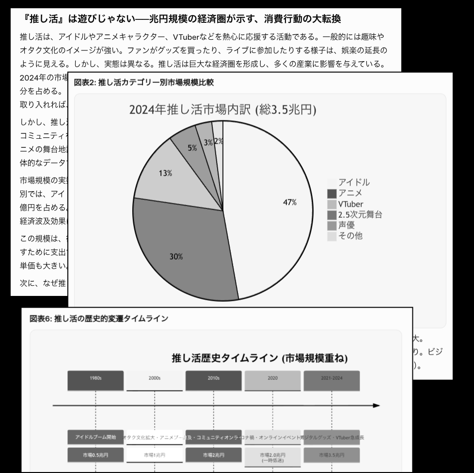 - さらに以下の指示を出す。「7つの調査フレームワークすべてと、7つの執筆プロットのうちの1つを使って、“推し活経済”について記事を作成します。高校生でも理解可能な平易な文章で、ビジネスパーソン向け一般メディアに掲載することを前提にDeep Research記事を書かせるプロンプトを生成してください。表やグラフ、チャートを記事中になるべくたくさん含めて理解しやすい内容にしてください。」