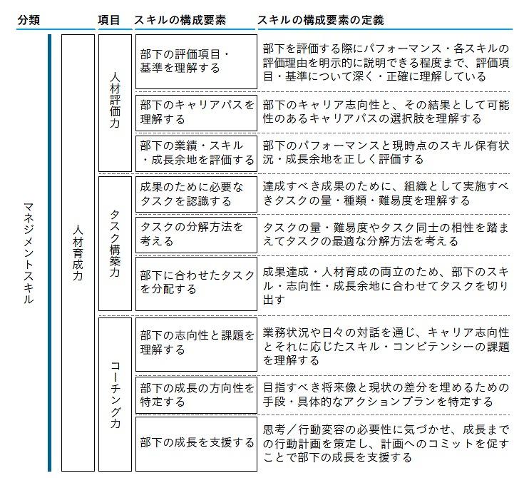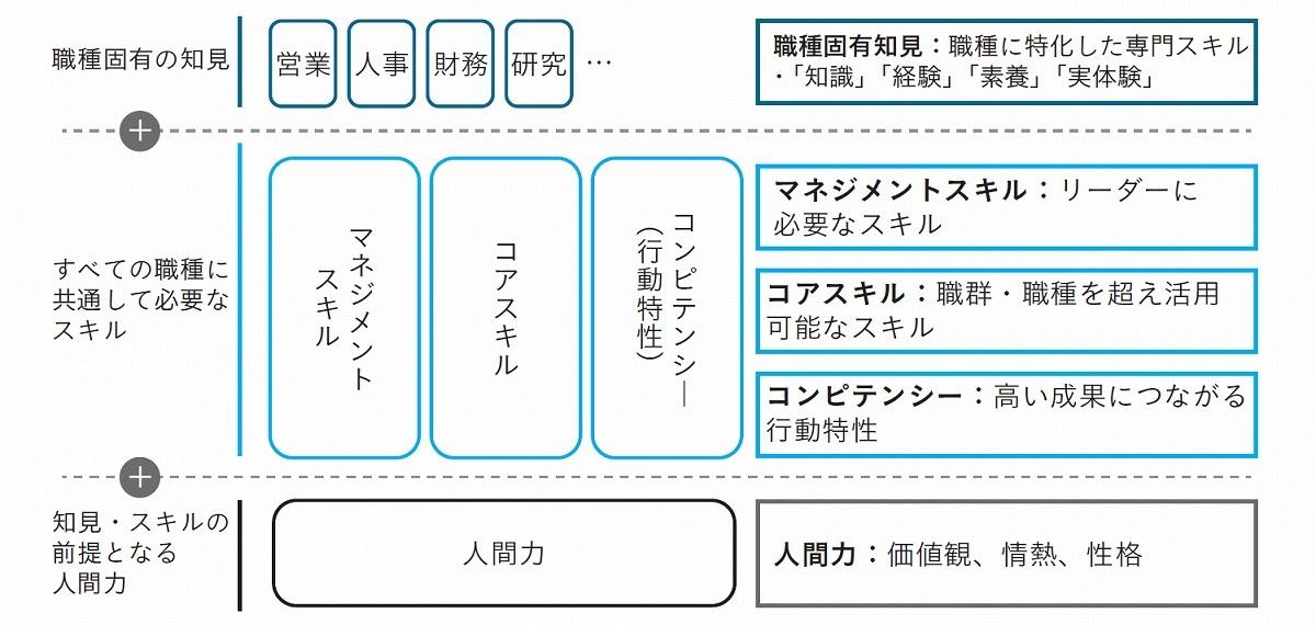 職種固有の知見は、職種に特化した専門スキルで、知識、経験、素養、実体験で習得する。共通スキルには、管理職に必要な「マネジメントスキル」、どの職群・職種にも必要な「コアスキル」、高い成果につながる「コンピテンシー(行動特性)」がある。スキル型人事制度において特に重要なスキルがコアスキルで、どの職種にも活用できるという意味でポータブルスキルと呼ばれる。最後に人間力は、価値観、情熱、性格から構成される。