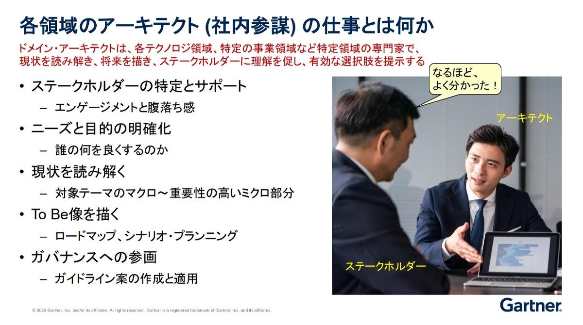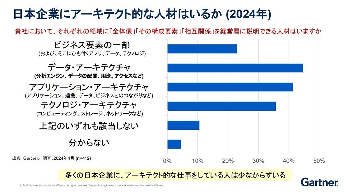 ガートナーの調査によると、ビジネス要素やデータ/アプリケーション/テクノロジー・アーキテクチャーの各領域の全体像や構成要素を経営層に説明できる人材は日本企業にも少なからず存在する。そうした人材がアーキテクト候補となる。