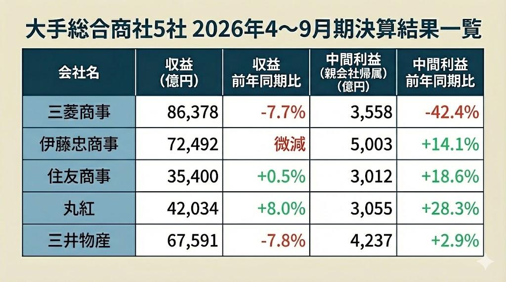 三菱商事、三井物産、伊藤忠商事、住友商事、丸紅の総合商社大手5社の2026年3月期第2四半期(中間)決算が出そろった。三菱商事の中間期収益は8兆6,378億円と、前年同期比では7.7%の減収となり、親会社の所有者に帰属する四半期利益は3,558億円で42.4%減と大きく落ち込んだ。前年の豪州原料炭事業売却益や千代田化工建設関連の引当金戻入の反動に加え、ローソンの持分法適用化が響いた格好だ。