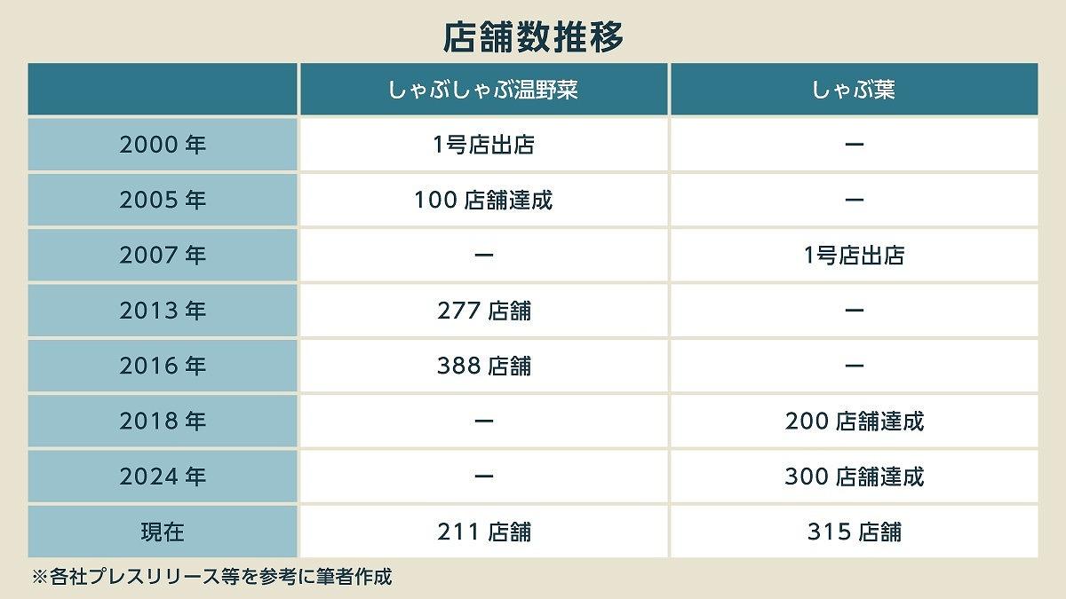 温野菜としゃぶ葉が逆転したのは2022~2023年頃とみられる。温野菜は2016年に388店舗を展開しており、2019年9月には349店舗まで減少した。2021年時点ではまだ温野菜がトップだったが、2024年には220店舗を下回る。一方のしゃぶ葉は2018年に200店舗を突破し、2019年末には268店舗となった。2024年12月に300店舗を達成した。両社ともしゃぶしゃぶの食べ放題を提供する。温野菜は「温野菜コース」(税込4,048円)が基本で、「黒毛和牛コース」(同5,478円)など上位ランクのメニューも提供。ランチでは温野菜コースが200円ほど安くなる(一部店舗)。