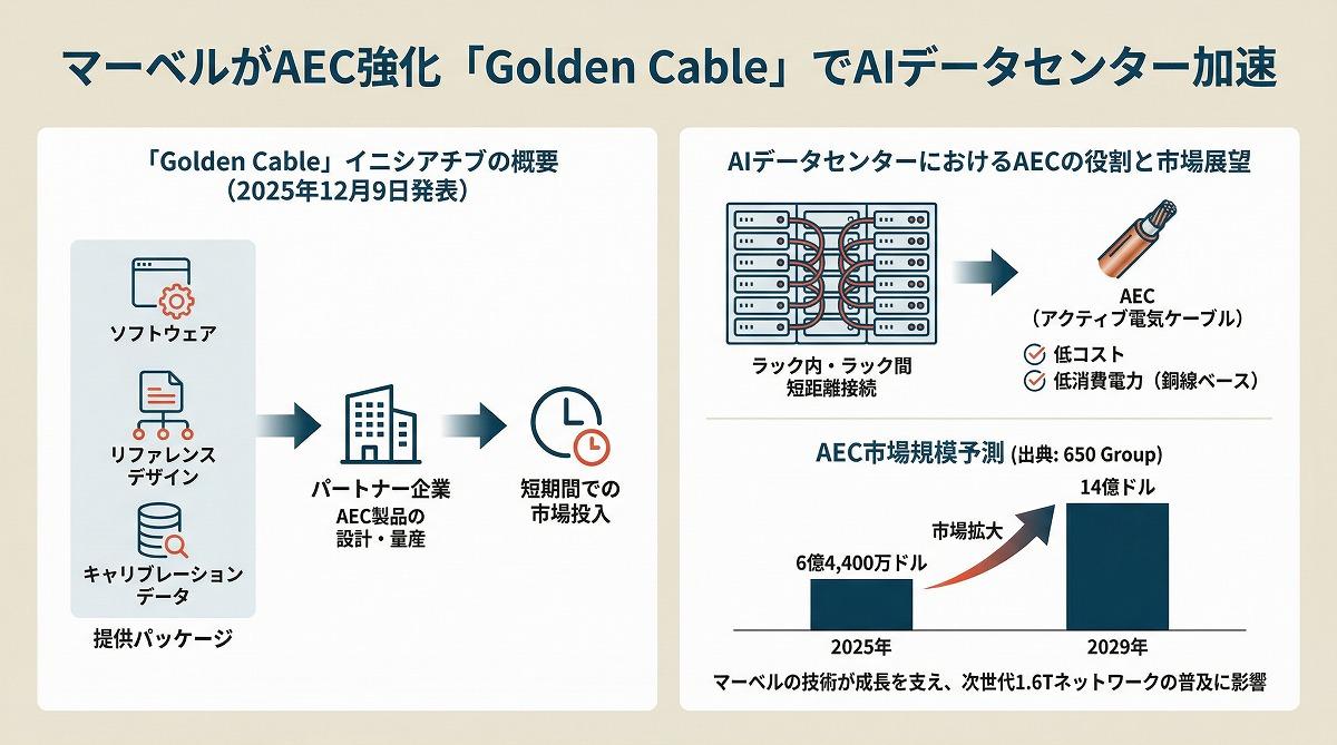 AI向けネットワークでは、ラック内・ラック間の短距離接続において、低コストかつ低消費電力な銅線ベースのAEC需要が高まっている。調査会社650 GroupはAEC市場が2025年の6億4,400万ドルから2029年に14億ドルへ拡大すると見込んでおり、マーベルは自社技術が成長を支えると位置付ける。こうした動きは次世代1.6Tネットワークの普及にも影響を与えそうだ。