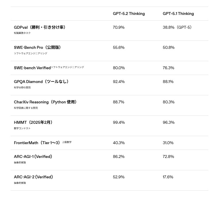 また、GPT-5.2発表にあわせてOpenAIはDisneyとの大型契約を発表し、同社から10億ドル規模の投資を受けるとともに、Disneyの知的財産を用いたAI動画生成などの分野で協業を進めることが明らかになった。この動きは単なるモデルアップデートにとどまらず、実用面や市場戦略の拡大を見据えたものとして評価されている。