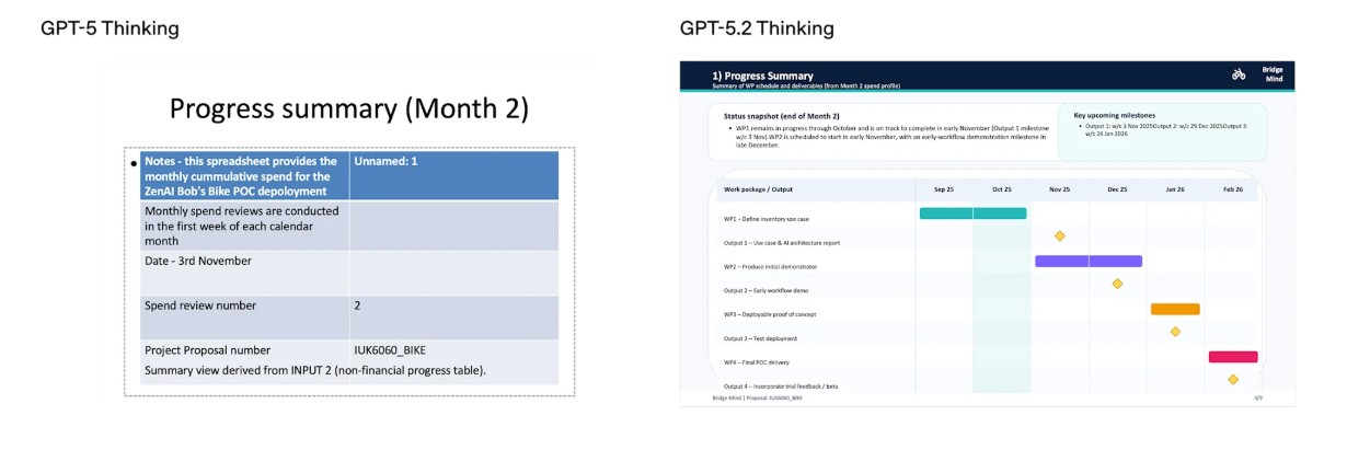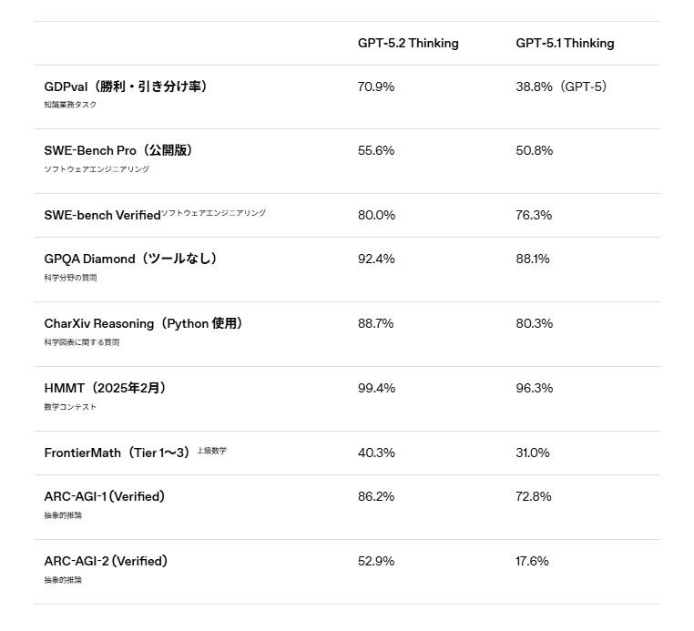 OpenAIはGPT-5.2をプロフェッショナルな知識作業向けとして位置付け、複雑かつ段階的なプロジェクトの処理やスプレッドシート作成、プレゼンテーション生成などの実務タスクへの適用を強調している。これらの能力向上はGDPvalと呼ばれる知識作業ベンチマークでも明示され、GPT-5.2は44職種にわたるタスクで業界の専門家と比較して高い処理速度と低コストを実現したという報告がされている。