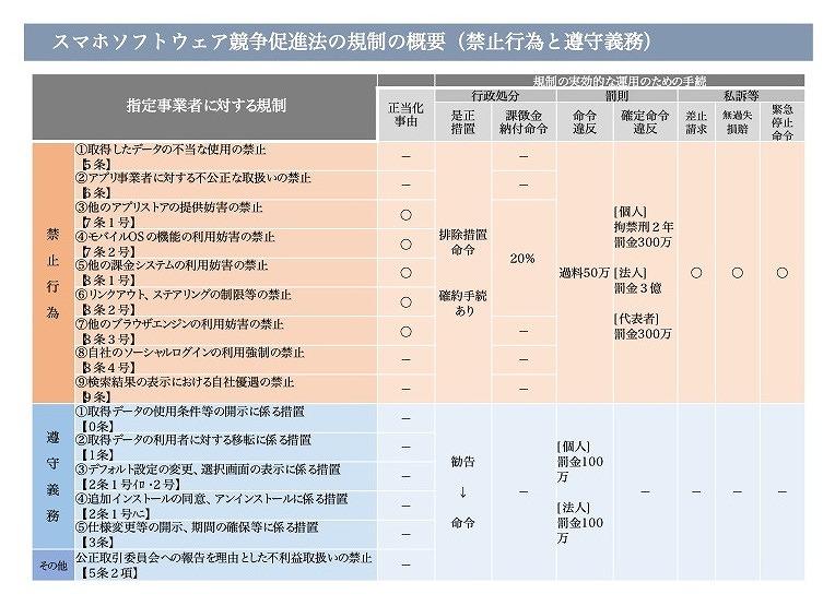 スマホ法では9つの禁止行為、5つの遵守義務が定められている。主なものとしては、サードパーティー事業者が新たにアプリストアを始めることを妨げる行為の禁止、ほかの課金システムの利用を妨害する行為の禁止、通信機能やGPS機能などOS機能の利用を妨害する行為の禁止、アプリから外部サイトなどに移動するリンク設置などを制限する行為の禁止、などがある。エンドユーザー視点では、iOSからAndroid端末あるいはAndroidからiOS端末に機種変更する際に、データの移行を安全かつ今よりも円滑に移転できるようにすることが求められている。