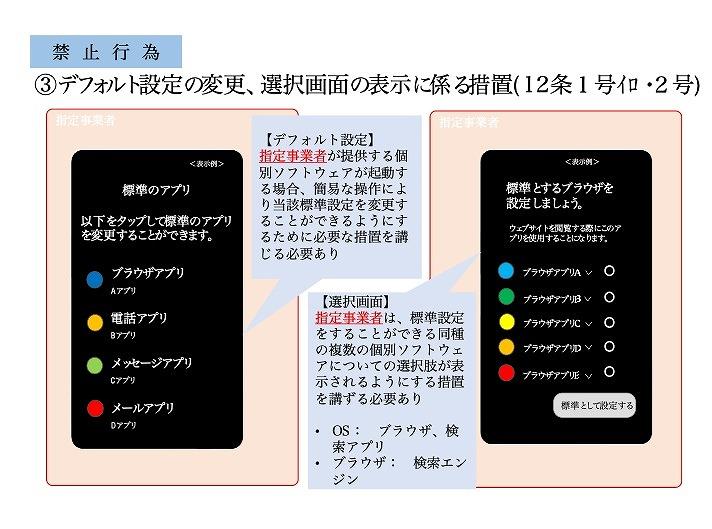 また、ブラウザと検索エンジンについて、デフォルトで設定されているもの以外も選べるように、OSアップデート時や新端末の初期設定時に選択画面(チョイススクリーン)を表示することが求められている。この選択画面はすでに導入され始めており、スマホ法施行時に本格導入となる。