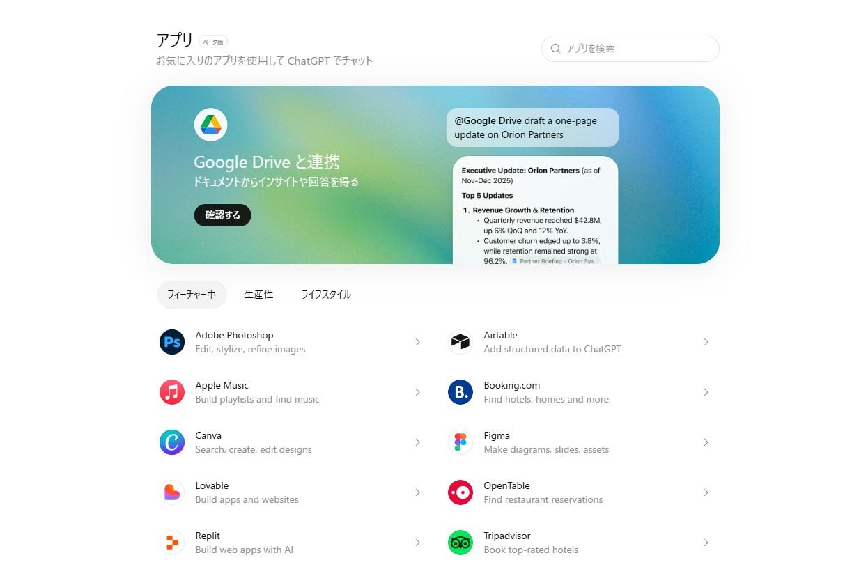 App Directoryでは、業務効率化、データ分析、画像生成、開発支援など用途別にアプリやツールが整理されており、ユーザーはChatGPTの画面上から目的に応じた機能を選択して利用できる。これまで個別に探す必要があった拡張機能や連携サービスを一元的に提供することで、利便性を高める狙いがあるとされる。