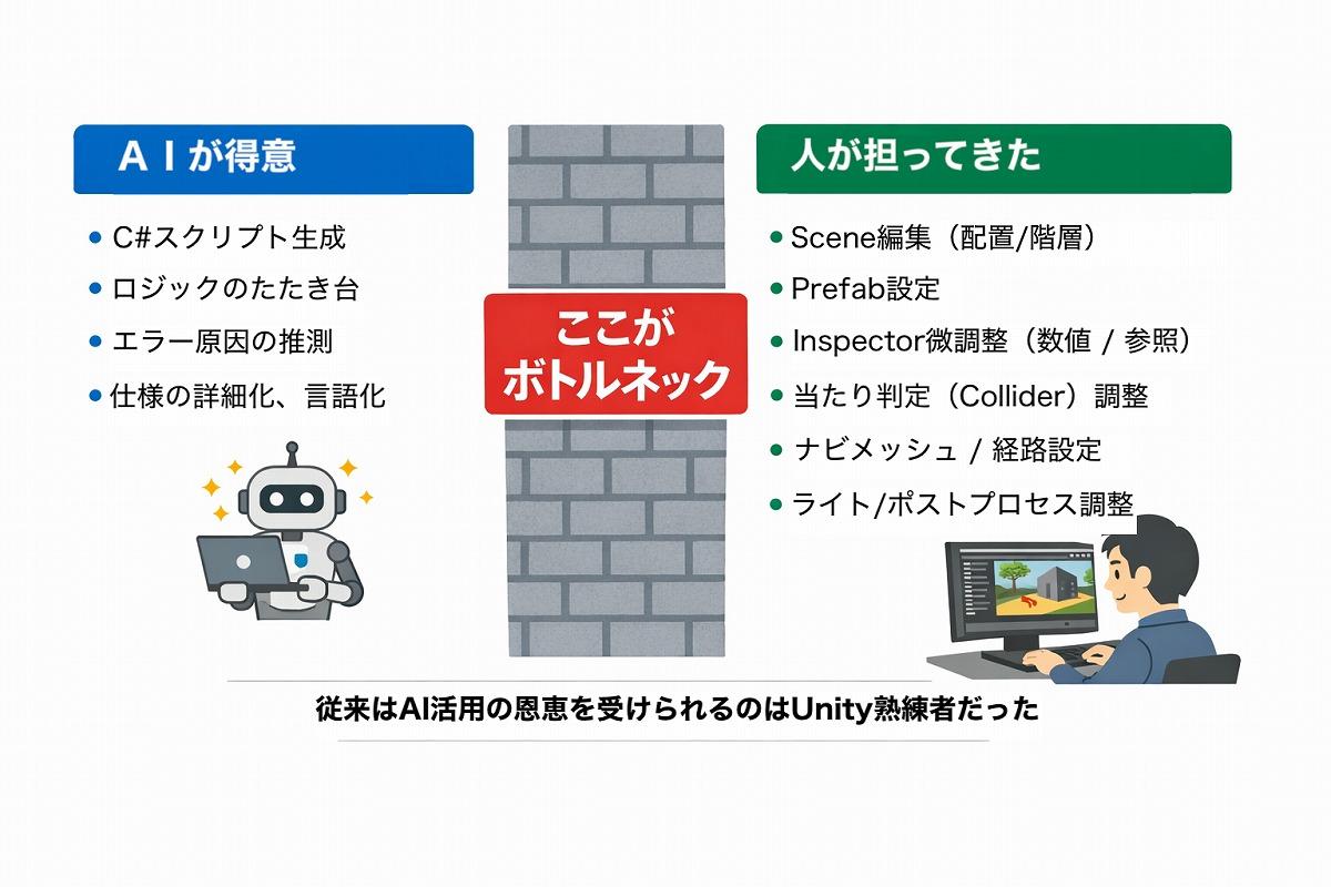 Unityの場合、ゲームのキャラクターや背景の動きはC#というプログラミング言語で記述する。このC#スクリプトをAIに書かせることはできても、Unity上でゲームのシーンやオブジェクトを配置したり微調整する作業は、ずっと人間のエンジニアが担ってきた。つまり、Unityに熟達した人だけがAIによるプログラム開発の効率化の恩恵を受けられる状況だった。UnityをAIエージェントから自動操作するための「Unity-MCP」も複数の開発者によって提供されてきたが、ゲーム開発に必要な機能をすべて備えたMCPは存在しなかった。