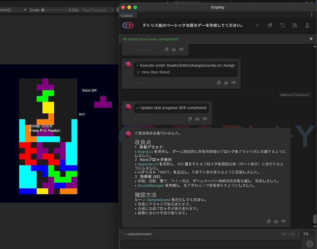 その状況が大きく変わった。Unityの機能を広く網羅した本格的なMCPが登場したのだ。このMCPを提供しているCoplayDevは、Unity本体に組み込むAIエージェント「Coplay」も提供している。Coplayは現状でも完成度が高く、テトリス風の2Dゲームくらいなら、コードを書いたりUnity本体を手動操作したりすることなく、自動運転で完成させられる。テトリス風ゲームの場合、7種類の形状をしたブロックやブロックが落ちてくるステージ、得点カウンター、次に落ちてくるブロックの予告表示などが必要だが、これらの生成、配置、振る舞いを決める設定やスクリプトのコーディングをすべてCoplayだけで行える。
