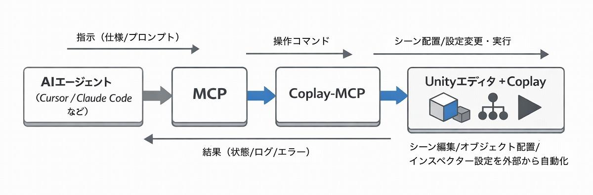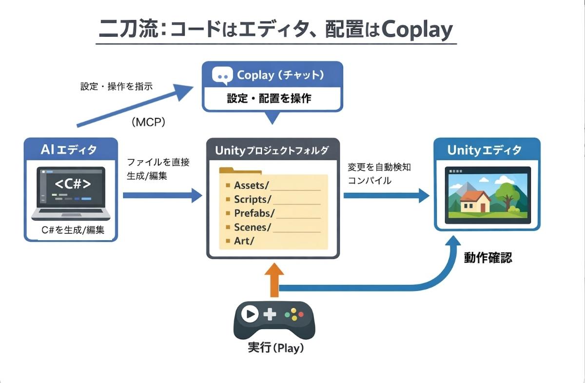 C#スクリプトについては、CoplayやUnityを通さずにCursorなどのAIエージェントが直接ファイルに書き込み、Unity側がそれを自動で検知してコンパイルする。ゲームキャラクターやステージの装飾品などのアセットも、AI側が直接フォルダを調べて把握できる。Unityで作成するプログラムはPCやMacのフォルダに保存されているので、そのフォルダをUnityとCursorで同時に開き、Cursor側でプログラムを作成・保存できる。