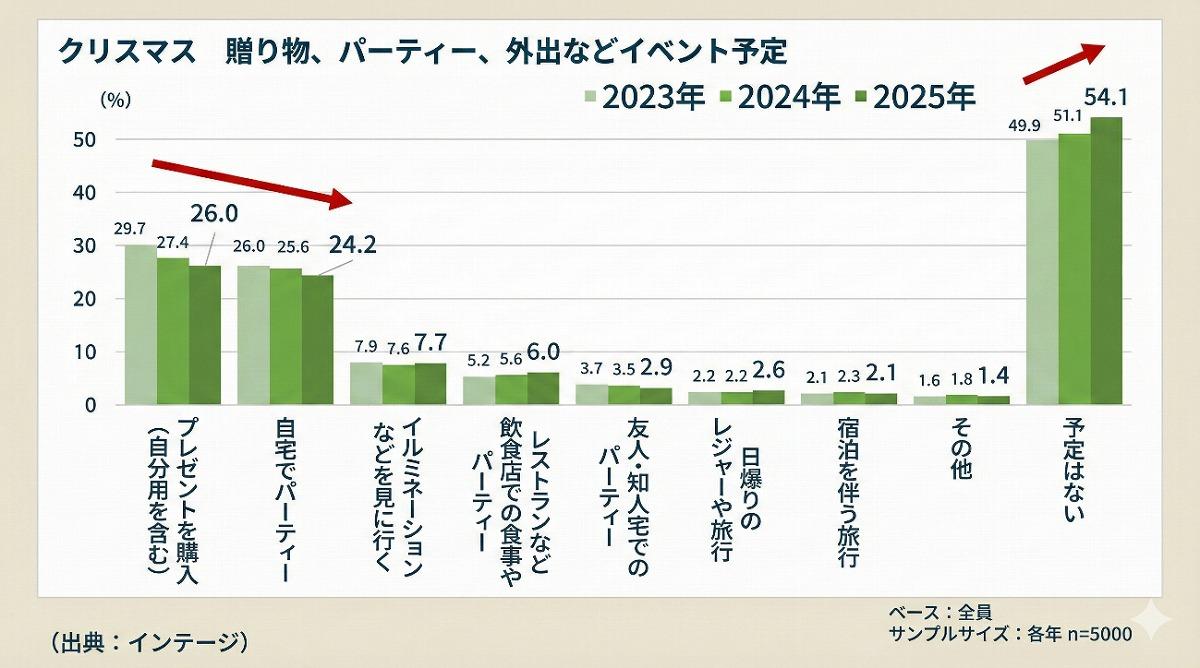 縮小の要因は、参加しない層の拡大に限られない。予定があると答えた層でも行動はやや弱含んだ。「プレゼントを購入(自分用含む)」は前年の27.4%から26.0%に、「自宅でパーティーをする」は25.6%から24.2%にそれぞれ低下した。