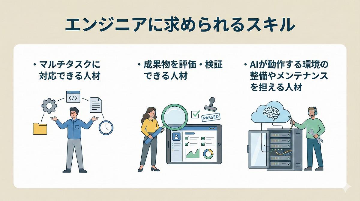 加えて、AIが出力する成果物を理解し、評価・検証できる力も欠かせない。AIは膨大なコードや設計書を短時間で生成するが、それをそのまま利用するのではなく、品質や安全性を担保するために人が目を通し、適切に修正・調整する必要がある。その役割を担う人材こそが、今後のエンジニア組織で求められる中核的な存在となる。