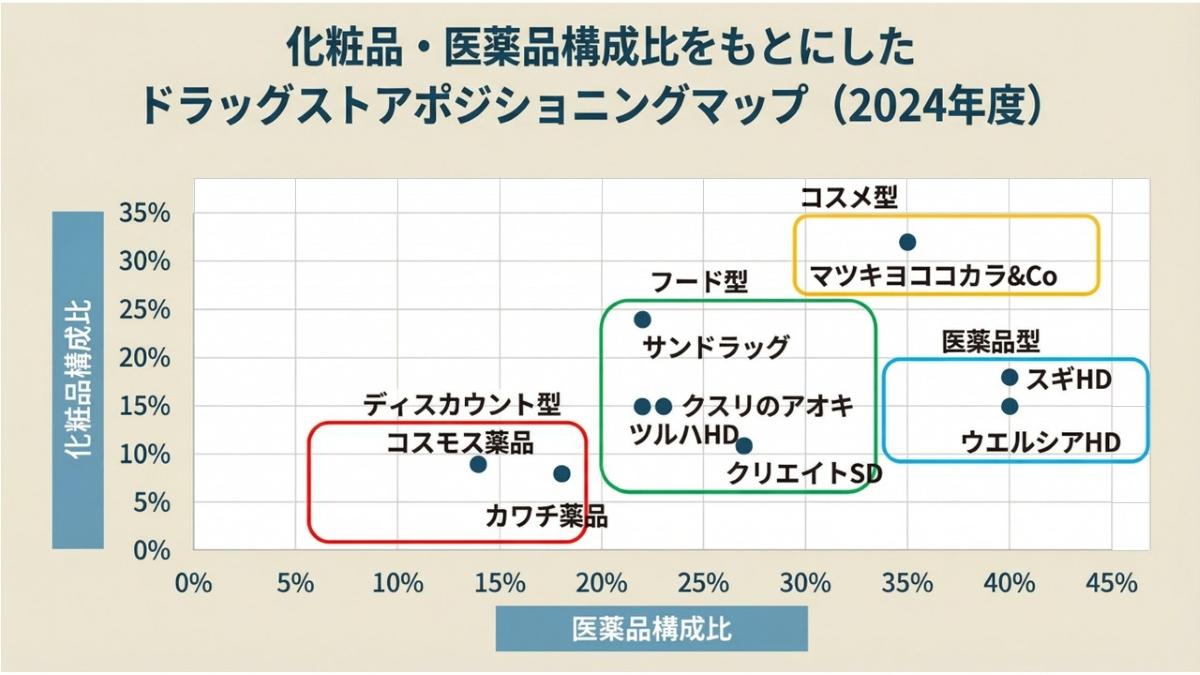 このような状況をまとめたのが下記の、日本の主要ドラッグストアにおける化粧品と医薬品の売上構成をもとにしたポジショニングマップです。