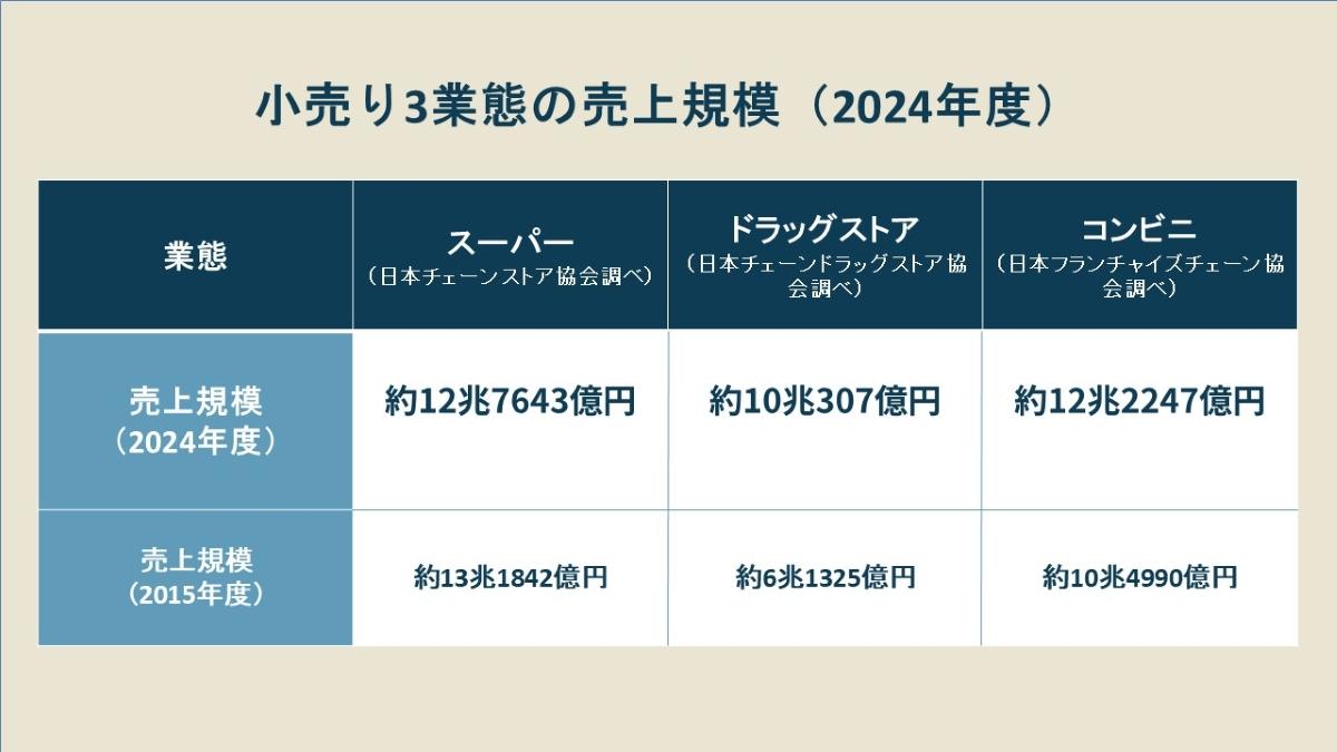 ドラッグストアは日本の小売り流通業態の中で、最も成長性の高い業態です。下記は日本のスーパー、ドラッグストア、コンビニの売上を比較したものです。