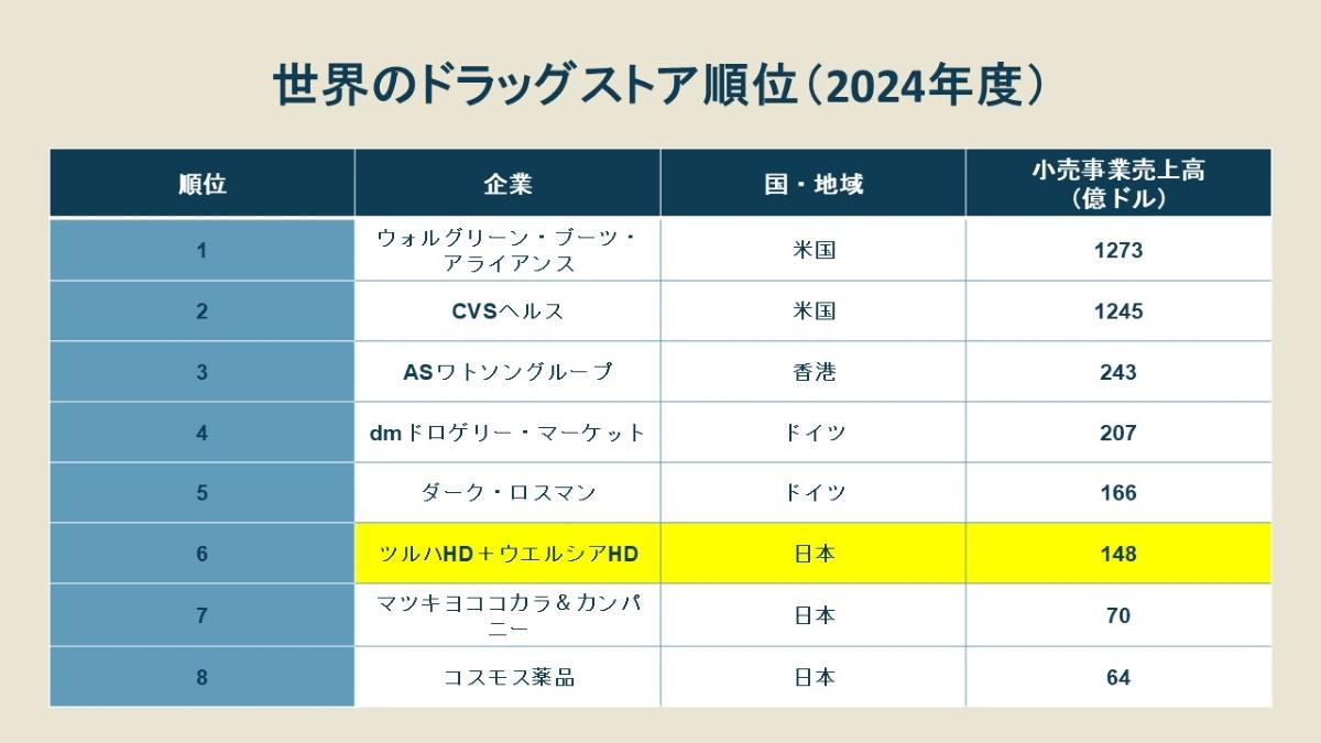 現在、世界のトップ2はウォルグリーン・ブーツ・アライアンス、CVSヘルスという、いずれも米国を主体とするドラッグストアチェーンで、ドラッグストアなどの小売り部門の売上が20兆円を超える巨大企業(※CVSヘルス社は健康保険やヘルスサービス事業も含めると24年度で50兆円以上の売上)です。