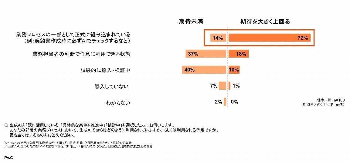 一方で、組織としては、こうした活用を「個人任せ」にしていては十分な成果につながりにくいという課題があります。効果を上げている企業ほど、AI活用をどの業務のプロセスに、どのレベルで組み込むのかを明確に定義し、ルールや標準プロセスを早期に整備しています(図表2)。