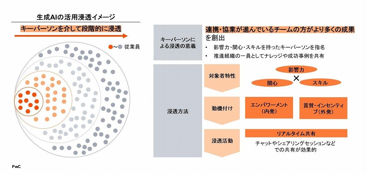 組織としては、こうしたスキルを個人任せにせず体系的に育成することが重要です。ですが、生成AIの業務での適用範囲や活用方法はさまざまなため、マニュアルだけでは対応しきれないことが多いのが実情です。生成AI導入の効果をより波及させるために、影響力・関心・スキルを持ったキーパーソンを指名し、推進組織の一員としてナレッジや成功事例を共有していくような取り組みも先行企業では実施されています(図表4)。