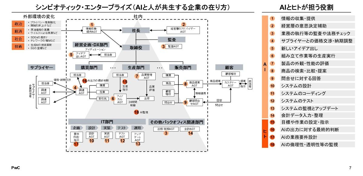 近年では、生成AIを「チームメンバー」として活用する事例も出てきています。AIが外部環境の変化やグローバル動向を踏まえて情報を収集し、それに基づいて新しいアイデア出しをし、意思決定を補助する──こうした一連の流れを一体的に支援する環境の構築が進みつつあります(図表7)。個人にとっては、これまでチームでしか成し得なかった作業を、AIを活用して1人で完結できるという新たな選択肢が生まれています。組織にとっては、人材配置やスキル構成を再設計する好機でもあります。どの業務をAIで代替・補助し、どこに人を配置すべきか。リスキリングによって社内人材を再配置するのか、新たに採用を強化するのか。こうした検討を早期に始めることで、AI導入による人とAIの協働モデルを確立できます。