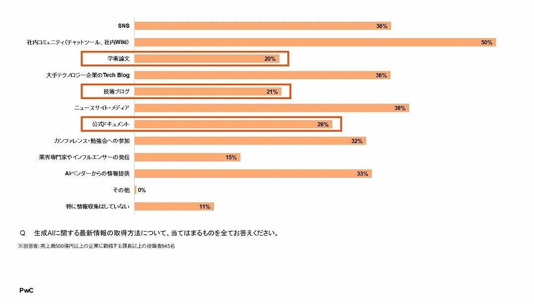 AIを単なる効率化ツールで終わらせず、キャリア成長につなげるためには、常に先端情報に触れ、自身のスキルを更新し続けることが欠かせません。PwC Japanグループの調査によれば、生成AIに関する情報を入手する際に学術論文・技術ブログ・公式文書など専門性の高いソースを活用している人が20%を超えており、深い知識を持つ人材が新しい価値を創出しています(図表9)。