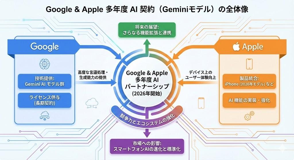 今回の発表は、AppleのAI戦略における重要な転換点となる。AppleはこれまでもAI機能の強化を進めてきたが、自社開発モデルのみでは競合他社との性能差を埋めるのが困難な状況にあり、Googleのモデルを導入することで一段の機能強化を図るとみられている。Geminiモデルの統合は、単に音声応答能力を向上させるだけでなく、より複雑なタスクやディープコンテキストを要するユーザーインタラクションにも対応できるように設計される。
