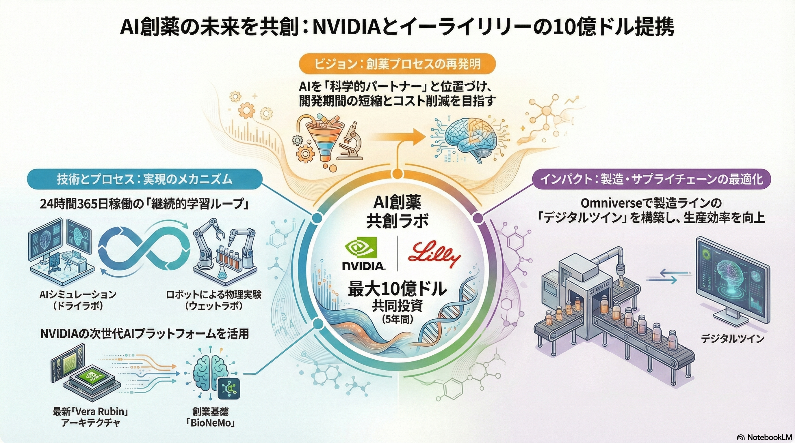 この共同研究施設の設立は、AIを活用した創薬が業界標準となる流れの中で、テクノロジー企業と製薬企業の協業が進む潮流を象徴している。大規模AIインフラを活用することで、従来よりも短期間での薬用候補化合物の特定や臨床試験への移行を目指す動きが加速している。エヌビディアとイーライリリーの提携は、AIが創薬プロセスに与える影響を具体化する重要な事例となる。