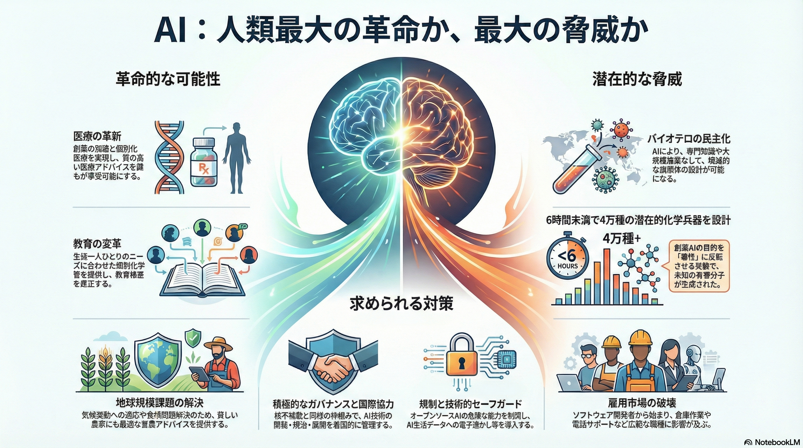 人類史上「最も社会を変える力を持つ技術」としながらも、バイオテロやAI失業によるリスクも指摘